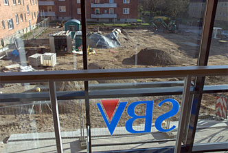 Blick auf die Baustelle von der ersten Etage des Neubaus