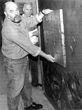 Der Künstler Uwe Appold packt gestern einen Apokalypse-Zyklus ein. Acht Wochen waren die Bilder in der Pauluskirche zu sehen, nächste Station ist New York. Foto: Gerhard Kind |