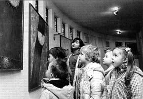 Mit großen Augen blickten die jungen Ausstellungsbesucher auf die großformatigen Werke des Künstlers und suchten eifrig nach wiederkehrenden Farben und geheimen Zeichen. Die Bilder erzählten auch Geschichten von Tagen, an denen es nicht hell wird, und von Schalen voller Zorn. ,,In meinen Zornschalen ist ganz viel Wut auf meinen Bruder", plaudert ein Mädchen munter drauf los und ließ deutlich werden, das sich gerade die kindliche Fantasie der in den Bildern verborgenen Symbolsprache unbefangen nähern kann. "Es gibt Tage, an denen man richtig zornig ist", griff Tappen die Gedanken der Jungen und Mädchen auf. Im Anschluss an die Führung konnten sie mit Pinsel und Farbe ihrer Fantasie freien Lauf lassen und eigene Zornschalen aufs Papier bringen.