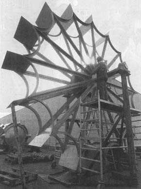 | ( hol ) Ein "Wasserrad auf Wanderschaft" können die Flensburger Autofahrer am nächsten Mittwoch bewundern. Dann wird das vom Flensburger Bildhauer Uwe Appold entworfene und von der Metallfabrik Lorenz gebaute Kunstwerk zu seinem zukünftigen "Drehort", dem Betonbecken vor der Holmpassage, überführt. Ganz im Gegensatz zur Montage (Dirk Lorenz: "Der Bau verlief völlig nach Plan") wird der Transport des fünf Tonnen schweren Rades aus Edelstahl nicht ohne Probleme verlaufen. Ein spezieller Tieflader und eine gut ausgewählte Fahrstrecke sind nötig, damit das Wasserrad mit einem Durchmesser von 6,50 Metern heil ankommt. "Wir werden es hochkant stehend auf den Spezialtransporter stellen und zu einer verkehrsarmen Zeit, so etwa um 9 Uhr, losfahren. Aufgrund der Höhe werden auf der Strecke sogar einige Hochspannungsleitungen "aufgehängt". Am Zielort wird das Kunstwerk von einem Kran ins Betonbecken gehievt und gleich befestigt. Und dann soll der freigelegte Mühlenstrom das Appoldsche Werk zum Rotieren bringen. |